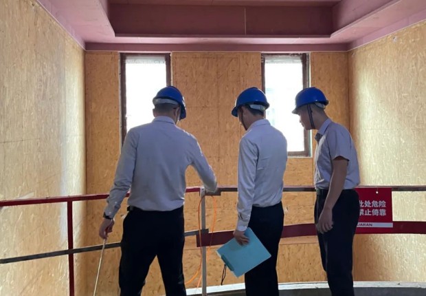 該工地現場正在安裝窗戶,巡檢員就整個木工階段施工進度以及現場衛生進行檢查。